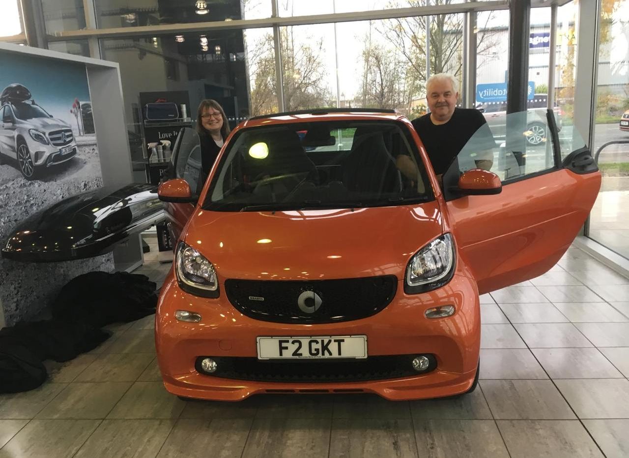 Gill and I collecting our smart Brabus in 2017